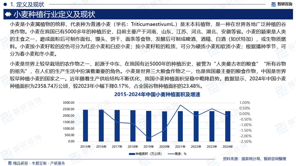 正在当下高度消息化的社会布景下,精准的数据阐发取深切的行业研究已成为企业计谋规划、市场拓展以及投资决策不成或缺的指南针。本研究演讲基于智研团队对行业的深刻理解取精准把握,通过采集全球范畴内的小麦种植行业数据,使用先辈的数据阐发模子,对行业的过去、现正在取将来进行了全面、系统的分解。深切挖掘了各个细分市场的运转纪律,对市场容量、增加速度、合作款式以及盈利模式等环节目标进行了详尽的量化阐发取质性解读。演讲内容不只涵盖了宏不雅经济的走势阐发、财产政策的深度解读,还包罗了买方行为的详尽描绘、手艺立异的趋向预测。我们分析使用了定量阐发取定性等多种研究方式,力图正在确保数据切确性的同时,也能捕获到市场动态中的微妙变化。此外,我们还出格关心了全球范畴内的行业领先企业,通过对比阐发它们的运营策略、市场结构以及立异能力,为业界读者供给了贵重的行业洞察取运营。做为业内出名的研究机构,智研研究团队深知高质量的研究演讲对于企业决策的主要性。因而,正在编撰本演讲的过程中,我们一直科学、严谨的研究立场,力图通过详实的数据、深切的阐发以及研判性的概念,为读者供给一份实正有价值的行业指南。小麦是小麦属动物的统称,代表种为通俗小麦(学名:TriticumaestivumL。)是禾本科动物,是一种界各地普遍种植的谷类做物。小麦正在我国已有5000多年的种植汗青,目上次要产于河南、山东、江苏、、湖北、安徽等省。小麦的颖果是人类的从食之一,磨成面粉后可制做面包、馒头、饼干、面条等食物,发酵后可制成啤酒、酒精、白酒(如伏特加),或生物质燃料。可分为硬质小麦和软质小麦;按照播种季候,可分为春小麦和冬小麦。小麦是世界上较早栽培的农做物之一,发源于中东,正在我国有近5000年的种植汗青,被誉为“人类最陈旧的粮食”“所有谷物的先人”,正在人们的出产糊口中饰演着主要的脚色。小麦是世界三大粮食做物之一,也是我国最次要的粮食做物,中国是世界较早种植小麦的国度之一。近年跟着出产供给布局不竭优化,数据显示,2024年中国小麦种植面积为2358。74万公顷,占全国谷植面积的23。48%。