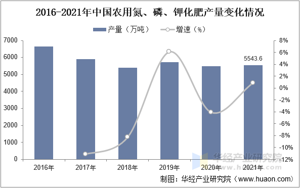 2015年中国农业部发布《到2020年化肥利用零增加步履方案》,化肥行业成长回归,行业运营从体起头升级转型,加上行业产能过剩、优惠政策退出、煤炭等原材料价钱上行等晦气要素影响,化肥行业产量起头持续下降,化肥企业纷纷起头转型升级。据材料显示,2021年我国农用氮、磷、钾化肥产量为5543。6万吨,同比增加0。9%。