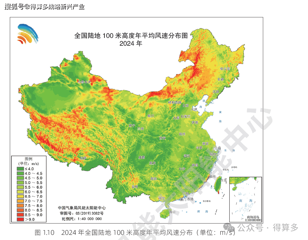 2024 年,我国100 米高度年平均风速约为5。8m/s。从空间分布(图1。10)看,东北大部、大部、华北北部、新疆东部和北部的部门地域、青藏高原、中部、陕西北部、甘肃西部、云贵高原、四川西部、广西大部、华东北部,以及中东部地域沿海等地年平均风速大于6。0m/s,此中,东北地域西部和东北部、中部和东部、新疆东部和北部的部门地域、甘肃西部、青藏高原大部等地年平均风速达到7。0m/s,部门地域达到8。0m/s 以上。