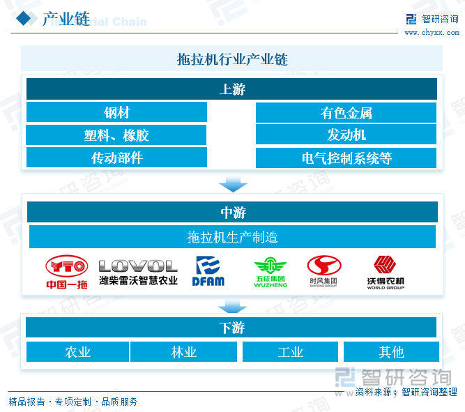 拖沓机行业财产链是一个涵盖原材料供应、制制拆卸、发卖使用及售后办事的分析性系统。上逛财产链以钢材、有色金属等原材料和策动机、传动部件等环节零部件的供应为从,为拖沓机的制制供给根本。中逛财产链则聚焦于拖沓机的制制、拆卸和发卖,确保拖沓机产物的质量和机能。下逛财产链则延长至拖沓机的使用范畴和办事环节,普遍使用于农业、林业和工业等范畴,同时供给全面的售后办事和手艺培训。跟着手艺前进和全球化趋向的成长,拖沓机行业财产链将愈加沉视手艺立异、环保要乞降全球化合作,为行业带来更多的机缘和挑和,鞭策拖沓机行业的持续成长和升级。