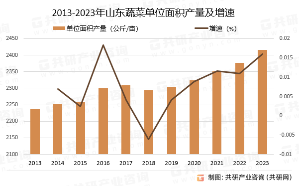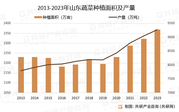 2013年以来,山东蔬菜种植面积、产量呈现波动增加态势,为蔬菜财产的成长供给了动力。2023年,山东蔬菜种植面积为2368。38万亩、产量为9272。41万吨,同比别离较2022年增加了45。63万亩、226。63万吨,增幅别离为1。96%、2。51%。