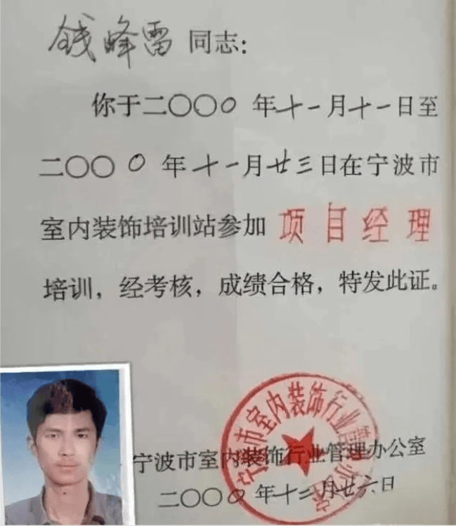 关于钱峰雷背后若何发家的故事人们领会并不多,良多人认为干这个行当次要就是胆量大,所谓“撑死胆大的饿死胆怯的”。2000年,钱峰雷还正在为室内拆修事业勤奋拼搏,并正在昔时11月11日一举拿下了宁波市室内粉饰行业办理办公室颁布的项目司理资历证书。