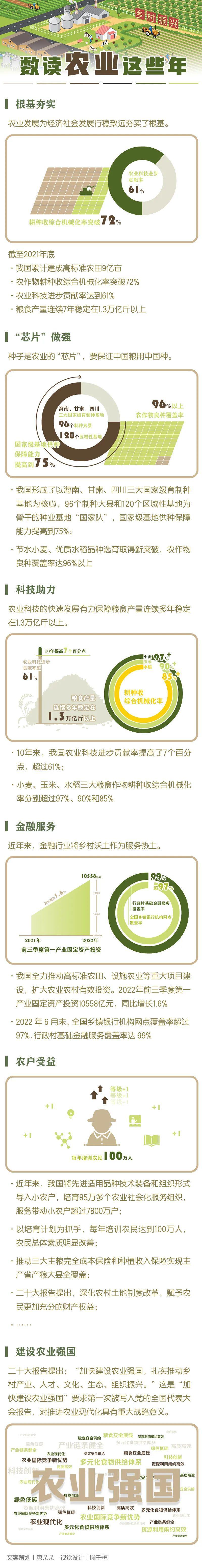加速扶植农业强国,必需持续完美轨制保障,好种粮农人好处,指导资金、人才、政策等资本要素向村落流动,成长农业、扶植村落、敷裕农人。健全种粮农人收益保障机制和从产区好处弥补机制。党的以来,我国出台了一系列强农惠农政策,稳步提高稻谷小麦最低收购价程度,完美稻谷补助、玉米大豆出产者补助等政策,鞭策三大从粮完全成本安全和种植收入安全实现从产省产粮大县全笼盖。“米袋子”省长要担任,也要担任。我国实行粮食平安党政同责,压实处所党委粮食平安义务,将年度粮食出产方针使命分化下达各省份,并鞭策粮食从产区、从销区、产销均衡区权利共担、义务共扛。为确保国度粮食平安和主要农产物稳产保供、推进农业强国扶植,地方财务近期提前下达2023年农业相关转移领取2115亿元。北方地域加强粮食等做物田间办理,南方省份推进高尺度农田扶植和丘陵山区农业机械化,加大多季和多种粮食出产体例摸索推广力度,加速成长优良高效农业。下一步,我国将加大产油大县励、社会化办事等项目对扩种冬油菜的支撑力度,调动农人积极性提高冬油菜出产,让“油瓶子”多拆中国油。让亿万小农户和现代农业无效跟尾。近年来,我国各地立异运营体例,培育好家庭农场、农人合做社,加速成立社会化办事系统,将先辈合用品种手艺配备和组织形式导入小农户,培育95万多个农业社会化办事组织,办事带动小农户跨越7800万户。党的二十大演讲指出,巩固和完美农村根基运营轨制,成长新型农村集体经济,成长新型农业运营从体和社会化办事,成长农业适度规模运营。农业农村部相关担任人暗示,下一步将加速培育新型农业运营从体,并支撑农业办事公司、村集体经济组织等各类从体鼎力成长单环节、多环节、全过程托管等办事,开展代耕代种、代管代收等社会化办事。手机“新耕具”、消息“新农资”、市场新需求,对农人本质提出了新要求。我国加鼎力度支撑农人教育培训,建立高档农业教育、高档职业教育和高本质农人培育的协同成长款式,以培育打算为抓手,每年培训农人达到100万人,农人总体本质较着改善。保住地盘“命脉”,农人吃上“定心丸”。为了更好保障农人好处、激活成长潜力,2014年地方一号文件明白农村地盘所有权、承包权、运营权“三权分置”政策,提出不变农村地盘承包关系并连结长久不变;2018年12月,十三届全国常委会第七次会议表决通过新点窜的农村地盘承包法,农村地盘“三权分置”入法。这些严沉轨制立异,为鞭策地盘运营权有序流转,鞭策粮食多种形式规模运营和农业现代化成长建牢了根底。党的二十大演讲提出,深化农村地盘轨制,付与农人愈加充实的财富权益。我国已做出明白摆设,要数量质量并沉,加强扶植、严酷管护,确保耕地数量不削减、质量有提拔。落实最严酷的耕地轨制,牢牢守住18亿亩耕地红线,划实补脚永世根基农田,强化耕地用处管制,遏制耕地“非农化”、根基农田“非粮化”,并成立以产能为根据的弥补耕地核算机制,规范耕地占补均衡。同时,逐渐把永世根基农田全数建成高尺度农田,使国度粮食平安根本愈加安稳。下一步,还将加强中低产田,分析操纵盐碱地,实施国度黑地盘工程,提拔耕地地力品级。完美农业支撑轨制,健全农村金融办事系统。近年来,金融行业将村落膏壤做为办事热土,勤奋补齐农村金融办事短板,把金融活水络绎不绝引向田间地头,精准滴灌农企农户,鞭策金融取财产良性互动。农业农村部相关担任人暗示,2022年前三季度农业投资继续增加。我国全力鞭策高尺度农田、设备农业等严沉项目扶植,扩大农业农村无效投资。2022年前三季度第一财产固定资产投资10558亿元,同比增加1。6%。按照银保监会数据,2022年6月末,全国乡镇银行机构网点笼盖率跨越97%,行政村根本金融办事笼盖率达99%。“十四五”规划和2035年近景方针纲要提出,健全农村金融办事系统,完美金融支农激励机制,扩大农村资产典质融资范畴,成长农业安全。这进一步为金融办事农业农村成长指了然标的目的。银保监会相关担任人暗示,将优化查核激励机制,确保涉农金融投入稳中有增;优化金融供给布局,金融支撑要沉点聚焦粮食平安、巩固脱贫攻坚、涉农运营从体、村落扶植等“三农”沉点范畴。新使命付与新,新征程展示新做为。我们将踔厉高昂推进农业现代化,加速扶植农业强国,为全面扶植社会从义现代化国度、全面推进中华平易近族伟大回复供给强无力支持。