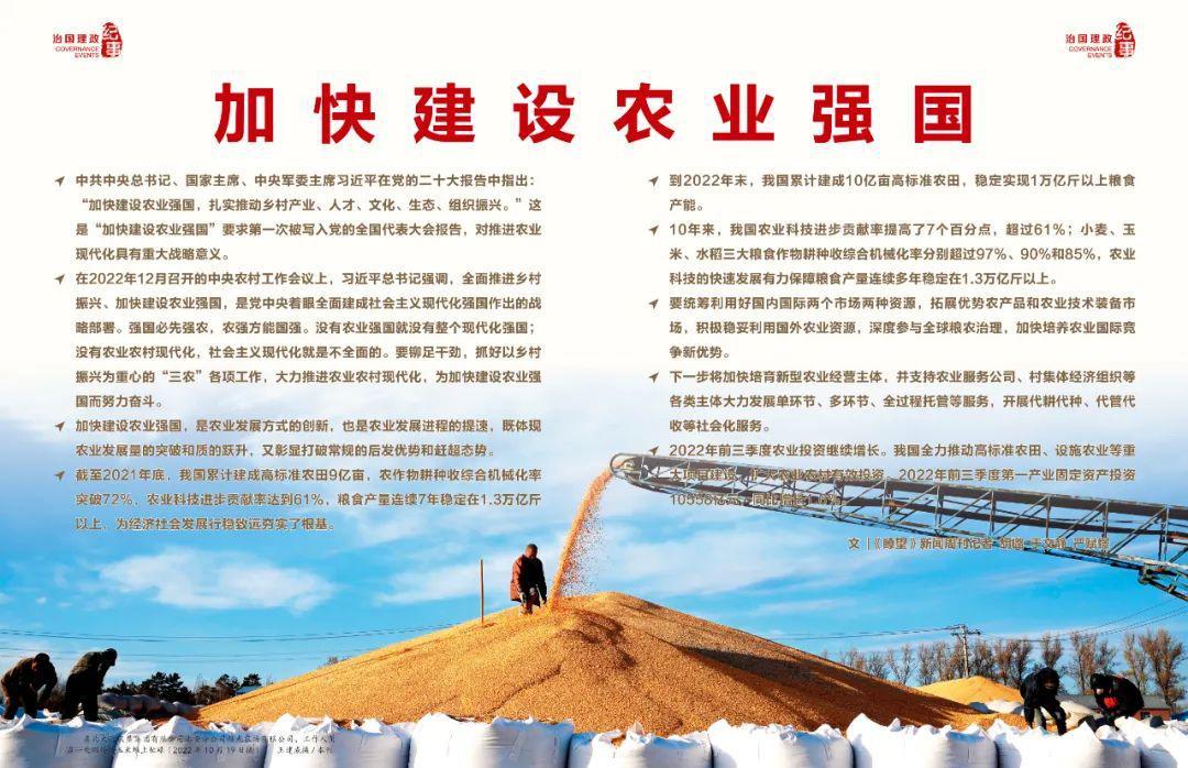 ◆ 地方总、国度、习正在党的二十大演讲中指出:“加速扶植农业强国,结实鞭策村落财产、人才、文化、生态、组织复兴。”这是“加速扶植农业强国”要求第一次被写的全国代表大会演讲,对推进农业现代化具有严沉计谋意义。◆ 正在2022年12月召开的地方农村工做会议上,习总强调,全面推进村落复兴、加速扶植农业强国,是着眼全面建成社会从义现代化强国做出的计谋摆设。强国必先强农,农强方能国强。没有农业强国就没有整个现代化强国;没有农业农村现代化,社会从义现代化就是不全面的。要铆脚干劲,抓好以村落复兴为沉心的“三农”各项工做,鼎力推进农业农村现代化,为加速扶植农业强国而勤奋奋斗。◆ 加速扶植农业强国,是农业成长体例的立异,也是农业成长历程的提速,既表现农业成长量的冲破和质的跃升,又彰显打破常规的后发劣势和赶超态势。◆ 截至2021岁尾,我国累计建成高尺度农田9亿亩,农做物耕种收分析机械化率冲破72%,农业科技前进贡献率达到61%,粮食产量持续7年不变正在1。3万亿斤以上,为经济社会成长行稳致远夯实了根底。◆ 10年来,我国农业科技前进贡献率提高了7个百分点,跨越61%;小麦、玉米、水稻三大粮食做物耕种收分析机械化率别离跨越97%、90%和85%,农业科技的快速成长无力保障粮食产量持续多年不变正在1。3万亿斤以上。◆ 要统筹操纵好国内国际两个市场两种资本,拓展劣势农产物和农业手艺配备市场,积极稳妥操纵国外农业资本,深度参取全球粮农管理,加速培育农业国际合作新劣势。◆ 下一步将加速培育新型农业运营从体,并支撑农业办事公司、村集体经济组织等各类从体鼎力成长单环节、多环节、全过程托管等办事,开展代耕代种、代管代收等社会化办事。◆ 2022年前三季度农业投资继续增加。我国全力鞭策高尺度农田、设备农业等严沉项目扶植,扩大农业农村无效投资。2022年前三季度第一财产固定资产投资10558亿元,同比增加1。6%。地方总、国度、习正在党的二十大演讲中指出:“加速扶植农业强国,结实鞭策村落财产、人才、文化、生态、组织复兴。”这是“加速扶植农业强国”要求第一次被写的全国代表大会演讲,对推进农业现代化具有严沉计谋意义。正在2022年12月召开的地方农村工做会议上,习总强调,全面推进村落复兴、加速扶植农业强国,是着眼全面建成社会从义现代化强国做出的计谋摆设。强国必先强农,农强方能国强。没有农业强国就没有整个现代化强国;没有农业农村现代化,社会从义现代化就是不全面的。要铆脚干劲,抓好以村落复兴为沉心的“三农”各项工做,鼎力推进农业农村现代化,为加速扶植农业强国而勤奋奋斗。党的以来,以习同志为焦点的农业农村优先成长,把保障粮食等主要农产物无效供给做为农业现代化的首要使命,不竭巩固提拔农业分析出产能力,取得显著成绩。截至2021岁尾,我国累计建成高尺度农田9亿亩,农做物耕种收分析机械化率冲破72%,农业科技前进贡献率达到61%,粮食产量持续7年不变正在1。3万亿斤以上,为经济社会成长行稳致远夯实了根底。正在近年来新冠肺炎疫情、乌克兰危机、极端气候频发等国表里形势复杂交错的大布景下,农业阐扬了主要的压舱石感化。同时,取新型工业化、消息化、城镇化比拟,农业现代化仍然是短板弱项。我国农业大而不强、多而不劣等问题次要表示正在:农业根本还不安定,抵当天然风险和市场风险能力较弱;运营规模小,质量效益和合作力亟待提高;资本束缚趋紧,粮食供求紧均衡款式尚未底子改变。农业强国是社会从义现代化强国的根底。早正在2014年,习总正在江苏调研时就曾指出,没有农业现代化,没有农村繁荣强盛,没有农人丰衣足食,国度现代化是不完整、不全面、不安稳的。迈上新征程,中国必需进一步勤奋,鞭策农业大国向农业强国改变。加速扶植农业强国,是立脚全面扶植社会从义现代化国度、着眼统筹“两个大局”做出的严沉决策摆设,明白了新时代新征程农业农村现代化的从攻标的目的,提出了全面推进村落复兴的严沉使命。2020年,习总正在探望加入全国政协会议的经济界委员时指出,新形势下,要出力处理农业成长中存正在的深条理矛盾和问题,沉点从农产物布局、抗风险能力、农业现代化程度上发力。纵不雅世界,一个国度要强大,必需有强大农业做支持。扶植社会从义现代化国度,农业不只是根本、是支持,更表现强国扶植的质量和成色。中国式现代化的特征之一,是生齿规模庞大的现代化。无论14亿多生齿的“餐桌幸福”,仍是亿万农人的丰收增收,都需要加速推进我国由农业大国向农业强国的逾越。“党的以来,我国农业现代化扶植取得了长脚成长,具备了由农业大国向农业强国迈进的根基前提,加速扶植农业强国合理当时、意义严沉。”农业农村部部长唐仁健说,要把加速扶植农业强国摆正在优先,鼎力推进农业现代化,推进农业高质高效,为全面扶植社会从义现代化国度奠基根本。当前,必需全面精确把握加速扶植农业强国的根基内涵。正在唐仁健看来,加速扶植农业强国,是农业成长体例的立异,也是农业成长历程的提速,既表现农业成长量的冲破和质的跃升,又彰显打破常规的后发劣势和赶超态势。保障粮食和主要农产物不变平安供给一直是扶植农业强国的甲等大事。中国人平易近大学农业取农村成长