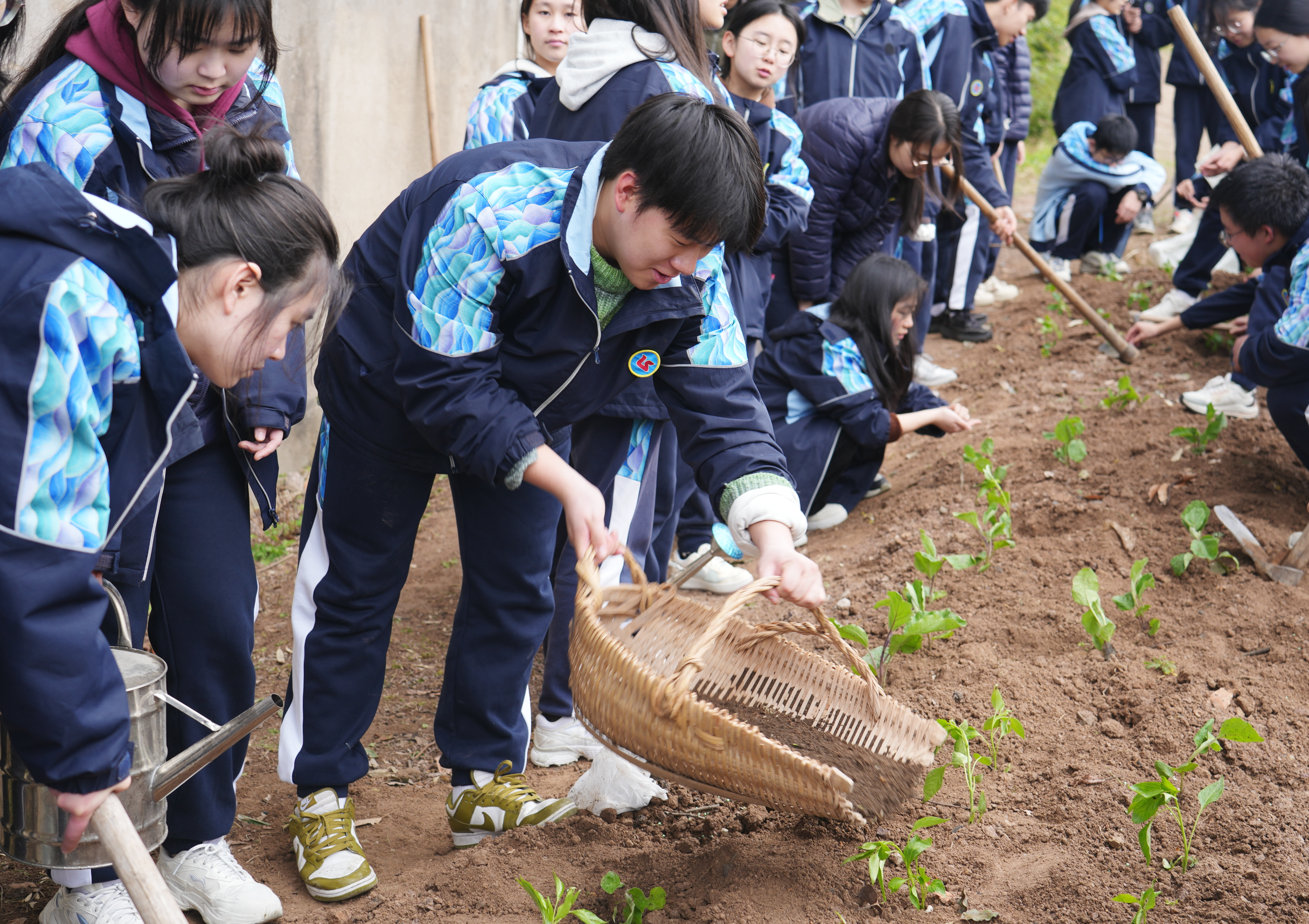 农耕文化节首日,该校高一、高二的学生走进学校丛林公园的劳动实践,正在田间地头开展春耕勾当。现场,大师扛起锄头、背起簸箕,正在专家和教员的指点下,按照流程翻土、播种、覆土、浇水、施肥等,亲手种下了尖椒、茄子、番茄等农做物,从中感触感染劳动之乐。